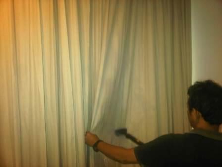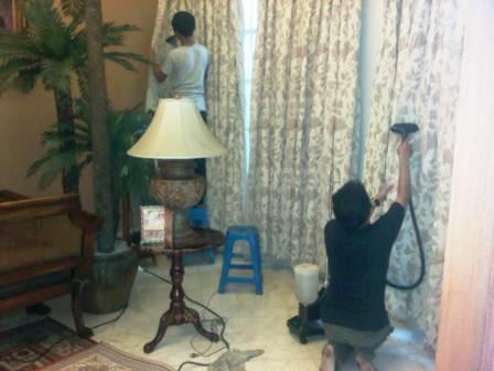 - Untuk permintaan cuci gorden DITEMPAT / rumah pelanggan ; metode yang dapat kami lakukan jika permintaan pengerjaan cuci gorden di tempat hanyalah ; menyedot debu, lalu men-steam (setrika uap) gorden, terakhir di beri pewangi. Semua di lakukan dalam posisi gorden tetap tergantung. Hal ini masih bisa kami kerjakan jika warna gorden gelap.Dengan harga cuci gorden di tempat Rp 20.000,- per meter2 untuk semua jenis gorden, untuk vitrase Rp 15.000,- per meter2 , dan untuk romance shade Rp 80.000 / lembar.